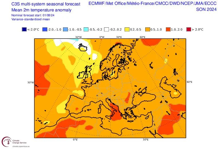 Προγνωστικοί χάρτες του ECMWF και του multi-modelsystem με τις αποκλίσεις της θερμοκρασίας για το Φθινόπωρο 2024 (3-month average), με αρχικές τιμές της 01/08/2024