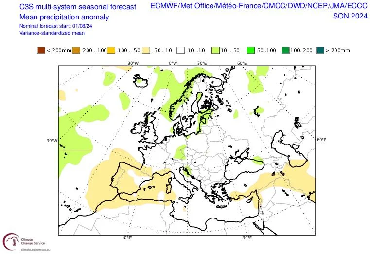 Προγνωστικοί χάρτες του ECMWF και του multi-modelsystem με τις αποκλίσεις του υετού (βροχόπτωσης) για το Φθινόπωρο 2024 (3-month average), με αρχικές τιμές της 01/08/2024