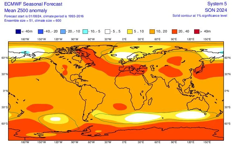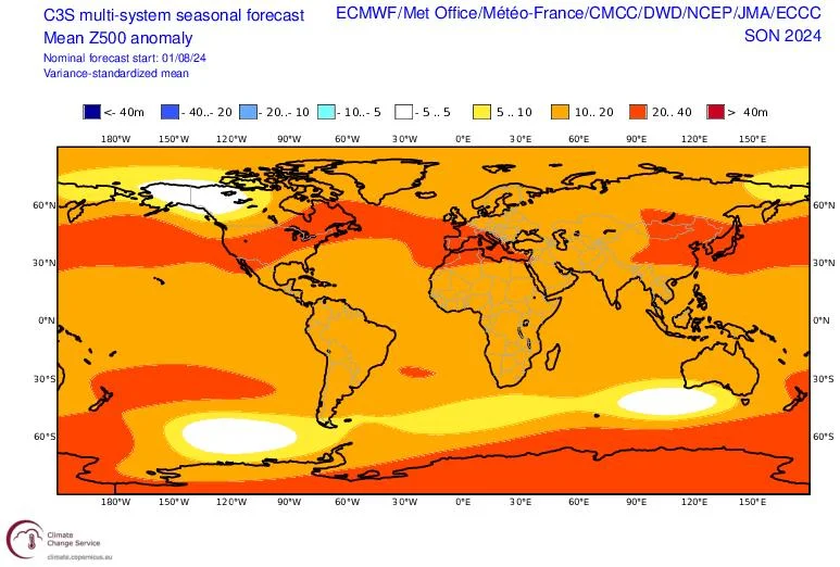 Προγνωστικοί χάρτες του ECMWF και του multi-modelsystem με τις αποκλίσεις των γεωδυναμικών υψών στα 500hPa για το Φθινόπωρο 2024 (3-month average), με αρχικές τιμές της 01/08/2024