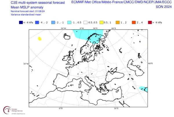Προγνωστικοί χάρτες του ECMWF και του multi-modelsystem με τις αποκλίσεις της ατμοσφαιρικής (βαρομετρικής) πίεσης στην επιφάνεια (MSLP) για το Φθινόπωρο 2024 (3-month average), με αρχικές τιμές της 01/08/2024