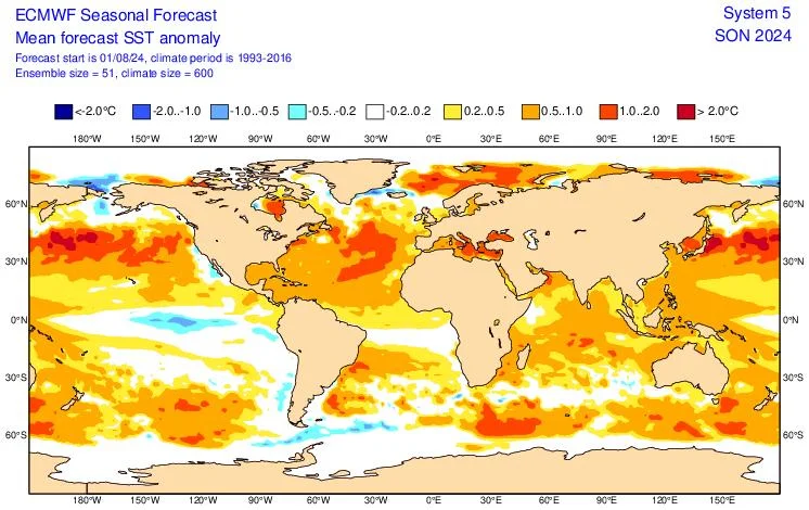 Προγνωστικός χάρτης του ECMWF με τις αποκλίσεις της θερμοκρασίας της επιφάνειας της θάλασσας (Sea Surface Temperature – SST) για το Φθινόπωρο 2024 (3-month average), με αρχικές τιμές της 01/08/2024