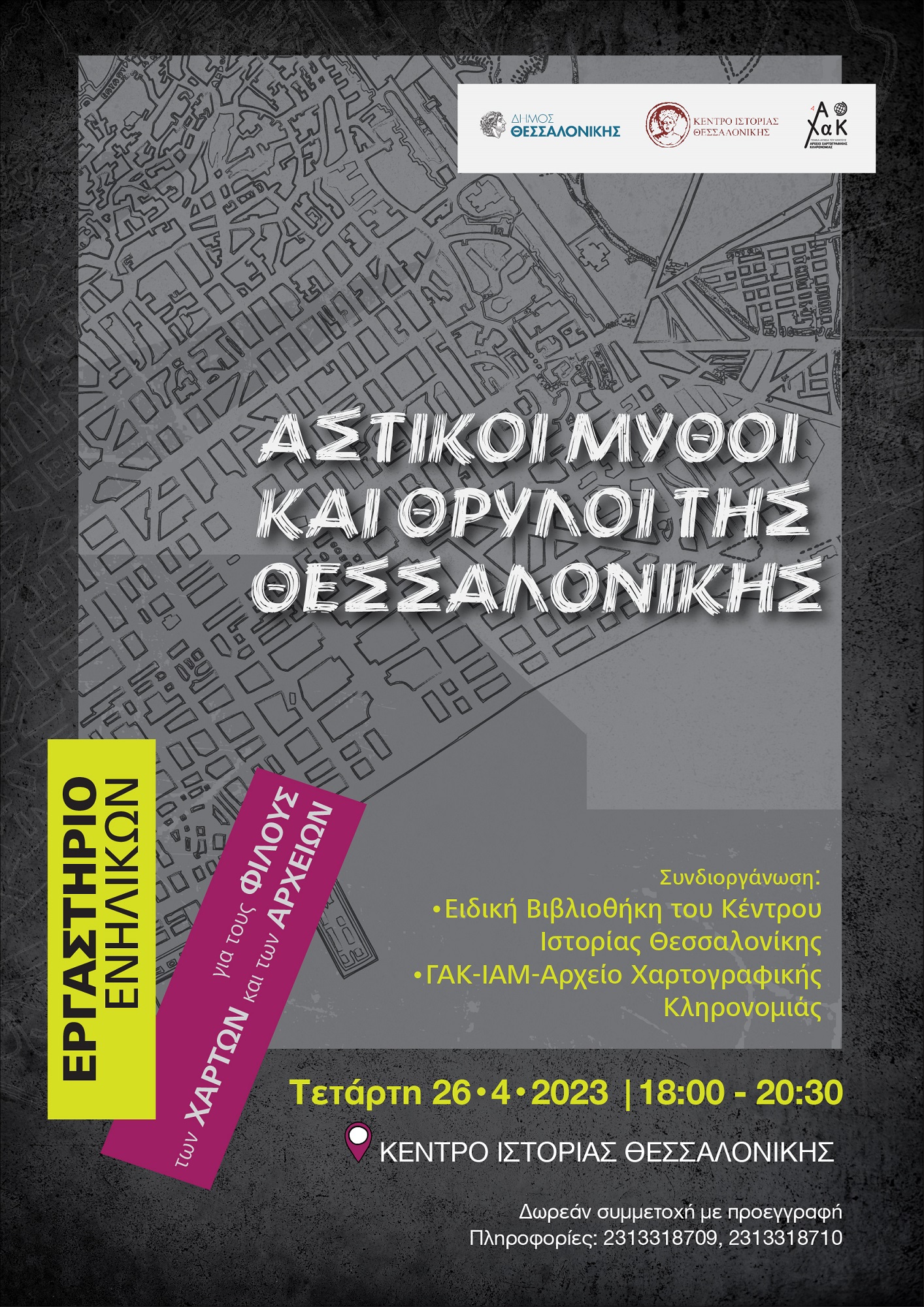 Εργαστήριο για ενήλικες φίλους των βιβλίων, των χαρτών και των αρχείων την Τετάρτη 26 Απριλίου 2023, διοργανώνουν το Κέντρο Ιστορίας Θεσσαλονίκης και το ΓΑΚ-ΙΑΜ-Αρχείο Χαρτογραφικής Κληρονομιάς με θέμα «Αστικοί μύθοι και θρύλοι της Θεσσαλονίκης, ματιές στην ιστορία και τη μυθολογία της πόλης μέσα από τη χαρτογραφική κληρονομιά».