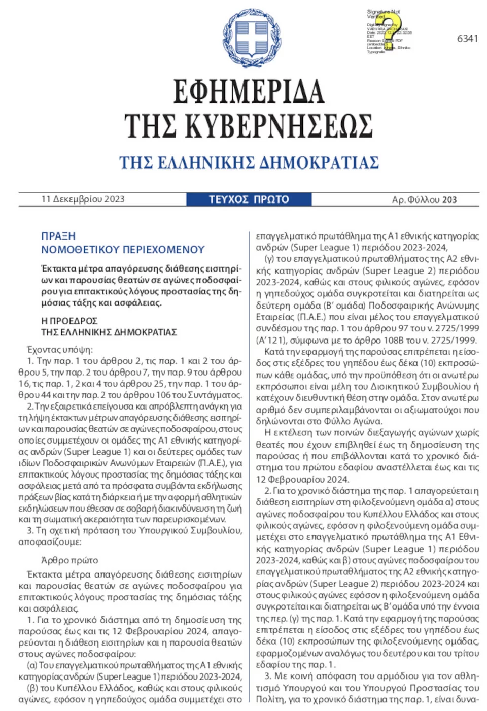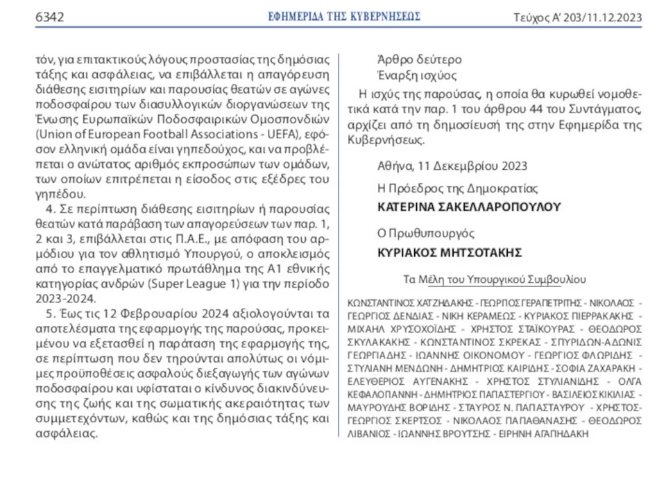 1. Για το χρονικό διάστημα από τη δημοσίευση της παρούσας έως και τις 12 Φεβρουαρίου 2024, απαγορεύονται η διάθεση εισιτηρίων και η παρουσία θεατών στους αγώνες ποδοσφαίρου: