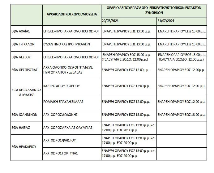 Συγκεκριμένα, σύμφωνα με ανακοίνωση του Υπουργείου Πολιτισμού, οι επισκέψιμοι αρχαιολογικοί χώροι σε Αχαΐα και Λέσβο, το Βυζαντινό Κάστρο Τρικάλων και ο αρχαιολογικός χώρος Δωδώνης θα λειτουργήσουν από την έναρξη ωραρίου έως τις 13:00, οι αρχαιολογικοί χώροι Γιτάνων, Πύργου Ραγίου και Ελέας στη Θεσπρωτία, το Κάστρο Αγίου Γεωργίου και η Ρωμαϊκή Έπαυλη Σκάλας στην Κεφαλλονιά από την έναρξη του ωραρίου έως τις 12.00, ενώ οι αρχαιολογικοί χώροι Αρχαίας Ολυμπίας, Φαιστού και Γόρτυνας από την έναρξη του ωραρίου έως τις 13.00 και από τις 15:00 έως τις 20:00.